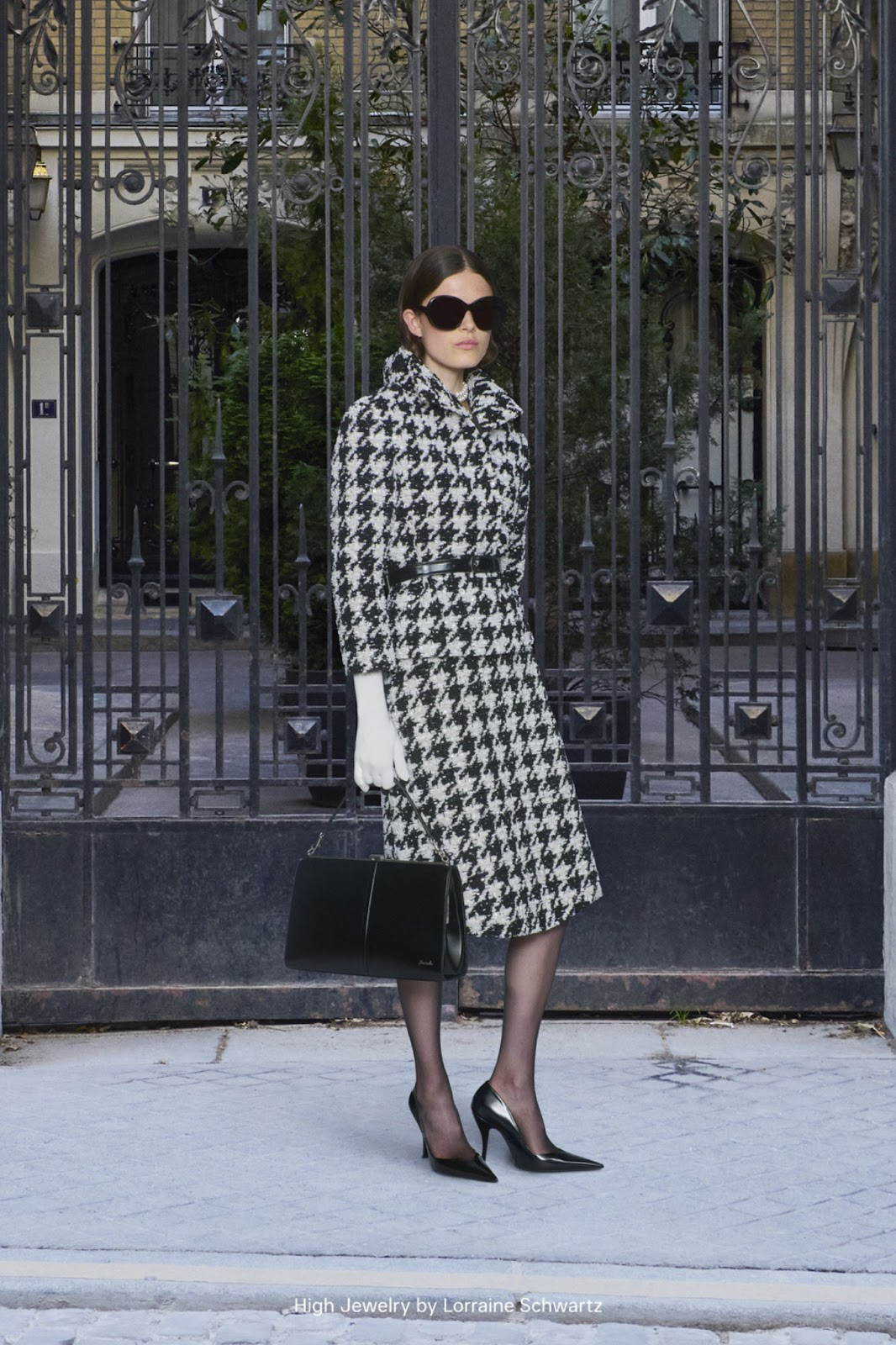 Look 8 of the 54th couture collection revives the Danielle suit — a houndstooth replica of a 1967 Cristóbal original, named after his favourite fitting model, Danielle Slavik. In 2022, Demna brought Slavik out of retirement to walk in his second couture show — a subtle gesture of respect for the house’s legacy. As Danielle herself put it, “there is something about [Demna] that I had found in Monsieur Balenciaga.” Image sourced via Balenciaga Couture © All rights belong to their respective owners. No copyright infringement intended.