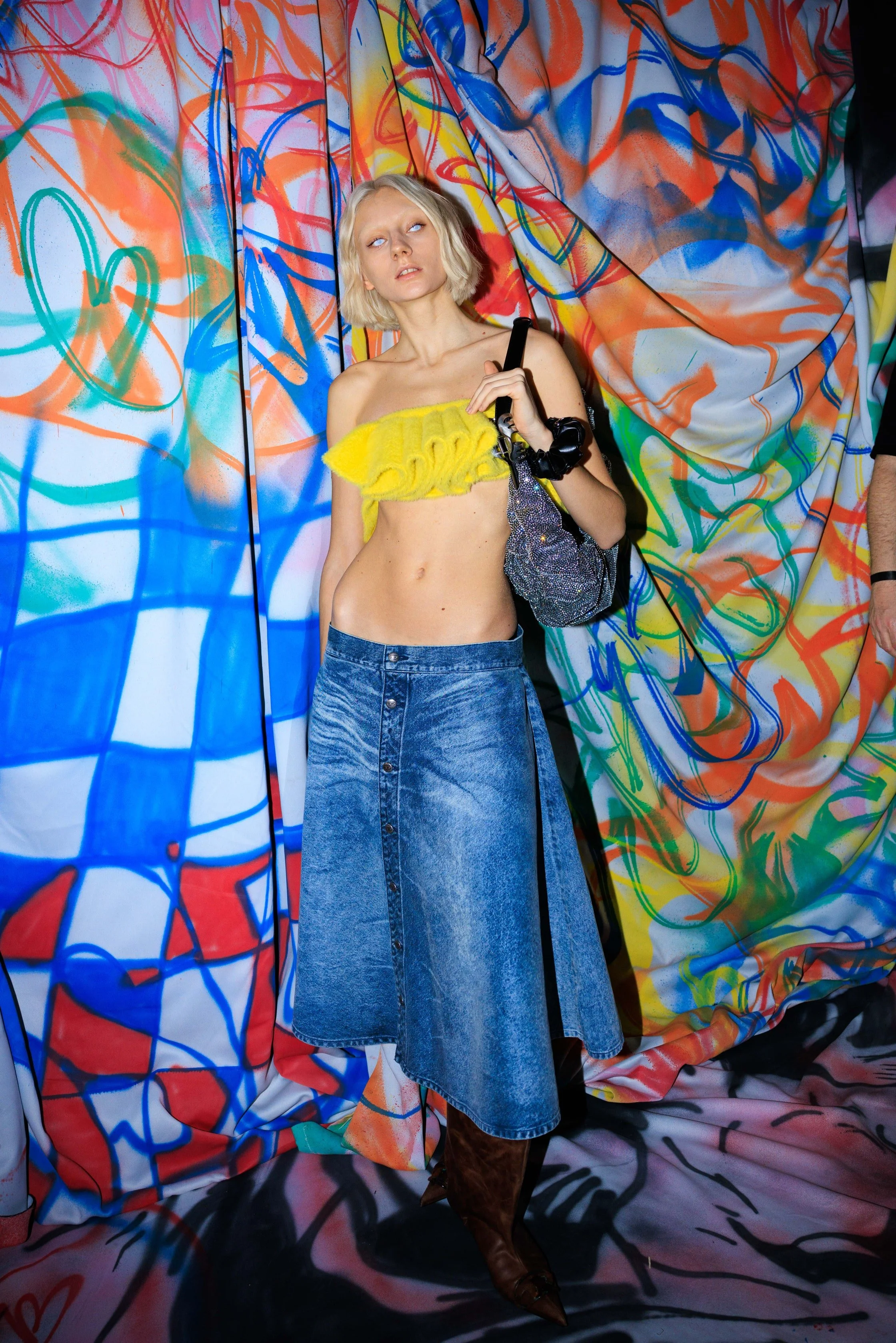 Backstage at Diesel Fall 2025 Ready-to-Wear. A model stands against a graffiti-splashed backdrop, embodying Glenn Martens’ chaotic elegance. The acid yellow ruffled bandeau teeters between DIY rebellion and sculptural precision, while the high-waisted denim skirt evokes a reengineered Y2K silhouette. Styled with iridescent accessories and dystopian whiteout lenses, the look captures Diesel’s signature: raw attitude, refashioned for the future. Photo by Acielle / Style Du Monde, made available via Vogue. © All rights belong to their respective owners. No copyright infringement intended.