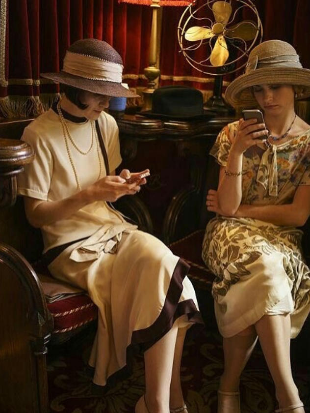 Michelle Dockery and Lily James on the set of Downton Abbey (2010-2015). Is the past interrupted by the future? Or is the present anxious about its relation to the lax yesterday and the tense tomorrow? Image available via Instagram, @downton._abbey. © All rights belong to their respective owners. No copyright infringement intended.