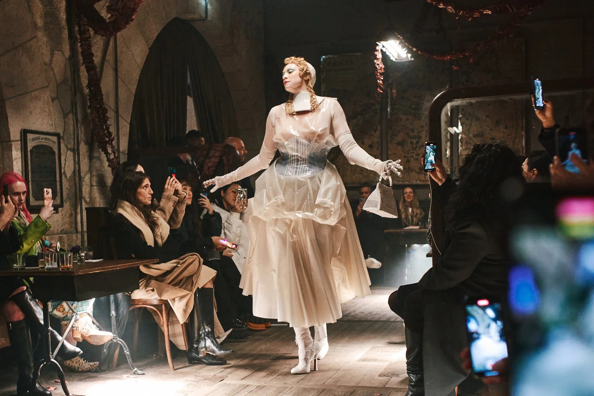 The setting was mesmerizing: a rain-soaked descent leading to a door that opened into a world imbued with the aura of a forgotten Parisian nightspot. Inside, amid cafe tables, spent drinks, and dim mirrors, Galliano transported us into a realm of his own creation. The ambiance was electric, charged with an eerie, yellowed light that set the stage for a parade of characters and couture that spoke Galliano's language in its purest form. The collection was a testament to Galliano's year-long devotion to craftsmanship. His use of ultra-extreme corsetry, padded hips, and erotically sheer lace dresses showcased a level of skill and imagination rarely seen. Chiffon-masked makeup, eerie doll-like body modifications, and wildly imaginative hairstyles complemented the garments, creating an otherworldly experience. Film projections on the mirrors added a surreal layer, blurring the line between the real and the imagined.